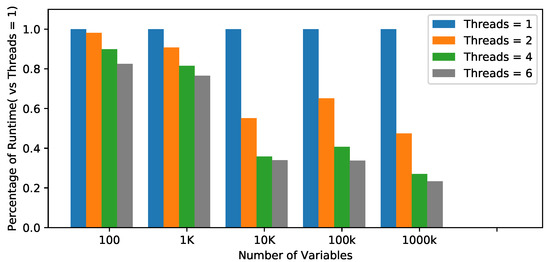 The evaluation results on the number of parallel threads are presented in Figure 6, in which the x-axis denotes the number of variables and the y-axis denotes the percentage of runtime compared with the runtime of non-paralleled method () spent on the same data as the baseline. It can be observed that the runtime of paralleled inference decreases significantly when the size of the variables is large. Specifically, when the number of threads is set to six, the runtime of inference decreases to 23% and 27%, respectively, on 1000 K and 100 K variables. However, if the variables are smaller than 1K, the runtime decreases only marginally with the increase of the threads. This should not be surprising because small tasks are not suitable for parallelization.