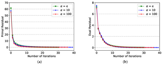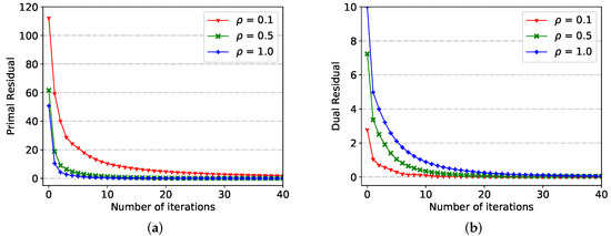 The evaluation results on the step size are presented in Figure 8, in which the parameter varies from to . It can be observed that the larger value of leads to a faster convergence speed on the primal residual and a slower convergence speed on the dual residual. Thus, the step size should be set to a proper value () to balance the two conditions.