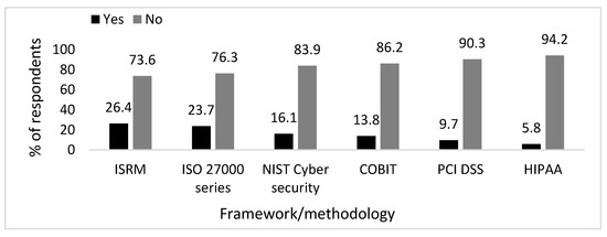 Figure 5 shows that the majority of the respondents (73% to 94.2%) indicated that the evaluation tools they used were not based on industry security standards and frameworks. Between 13% and 27% of the respondents had used evaluation tools based on industry standards and frameworks such as ISRM, the ISO 27,000 series, and the NIST cybersecurity. However, less than 10% of the respondents had used PCI DSS and HIPAA tools. These results indicate that there are underlying issues that lead to the poor use of industry standards and frameworks among SMEs.