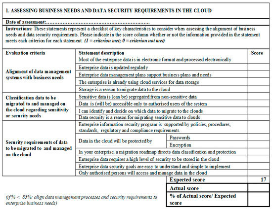 A checklist for use by decision-makers was created for each of the five components to be evaluated. Each checklist has several evaluation criteria and statements to guide the user on what to check during the data gathering process. A score of 1 is given for every true criterion; otherwise, 0 is given. The Actual score is the number of 1s on each checklist and this is compared with the Expected score. At the end of each stage, the user counts the number of 1s and records the actual score. An acceptable Actual score of 90% of the Expected score is needed for sensitive data and 70% for non-sensitive data. To move from the first to the second component, the former should be at least 85% of the enterprise’s business needs (the Actual score should be 85% of the Expected score). The evaluation checklists are shown in Figure 8, Figure 9, Figure 10, Figure 11, Figure 12 and Figure 13. The description of how to use the checklists during the evaluation is given after the figures.