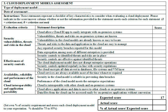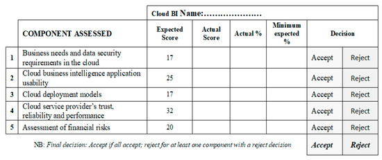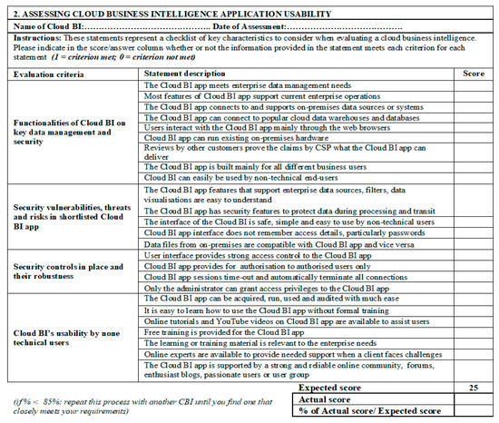 Seven checklists were provided as a means by which decision-makers will implement the framework. Several studies report checklists as a basic means of providing users with guidelines and criteria to implement a framework [45,54,61]. A study by Müller and Rood [55] encourages the use of checklists as guidelines to assess IT systems. When designing frameworks, researchers are encouraged to provide frameworks to guide the users of the framework on the implementation and metrics needed [54,55]. The checklists derived from the framework were validated as acceptable by SME decision-makers and IT security specialists. When designing the checklists, several factors were considered, including content, layout, language, and metrics to be used [53]. Similarly, the authors in [45,54] posit that an overlap of criteria items in checklists provides consistency in supporting the evaluation of key issues. Respondents confirmed that the checklists contain the basic ideas needed by decision-makers to embark on Cloud BI application evaluation on their own. The advantage of checklists in this study was that the majority of the SMEs were already familiar with their use as evaluation tools. Well-designed checklists should be easy to read and contain simple metrics for use by different users [56]. Due to the wide use of checklists by different enterprises, Müller and Rood [55] argue that users are free to modify them to suit their needs. The checklists provided in this study were meant to enable decision-makers to understand and conduct the process of security evaluation for Cloud BI application at their own pace and within their financial means [56].