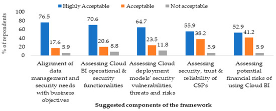 There was a significant association between the components and their relevance validation at p < 0.05. The acceptance level of the framework and checklists among IT specialists and decision-makers was high. The study concluded that the five main components of the conceptualised security evaluation framework were relevant and acceptable as they addressed basic important issues to be evaluated when selecting Cloud BI applications. The conceptualised framework enabled decision-makers to utilise the best practices from existing traditional industry standards and frameworks.