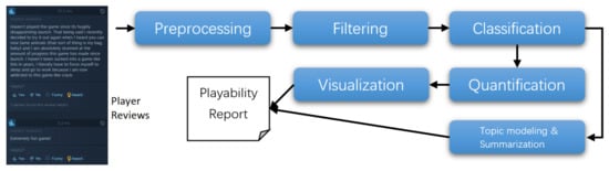 Figure 1 depicts the overview of the video game playability evaluation approach with each key step specified. The framework starts with collecting the player reviews from online platforms (e.g., Steam) via either API or web crawling. Then, we preprocess the obtained raw review data into structured form. The second step is to filter out the “non-playability-informative” reviews via a pre-trained classifier. With the obtained “playability-informative” reviews dataset, the third step is to classify the data into different playability perspectives according to a selected playability framework. For example, when selecting the framework of Paavilainen [8], the reviews are then classified into three perspectives accordingly, i.e., functionality, gameplay, and usability. With each review instance categorized into a specific perspective, the fourth step is to quantify the evaluation result of each perspective. Subsequently, the fifth step is to visualize such a result and present an intuitive summary. Meanwhile, the sixth step is to extract the existing merits and defects from each perspective by modeling and summarizing the topics of the reviews within. The output of both the visualization and topic modeling is then synthesized into a report.