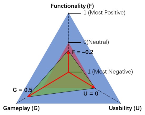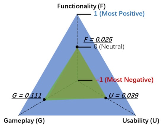 As shown in Figure 2, the line segments from the triangle center to each vertex represent the scales measuring each playability perspective. The distance between a green playability triangle vertex and the center represents the playability score in the particular perspective. The central point of each line segment is value 0 indicating the neutrality of the according perspective. The larger the green triangle is, the higher the overall playability score the game has. When the red area is shown in any direction, the playability of that game suffers in that particular perspective. Herein, the scale range indicating the positive and negative of each perspective is determined by the average sentiment score ranging from to 1. For this particular game example, after the analysis of its reviews through Algorithm 1, a result list is obtained. Based on such a result, Figure 2 is drawn. It shows the game is good for its gameplay (), mediocre for its usability (), and unsatisfactory for its functionality ().