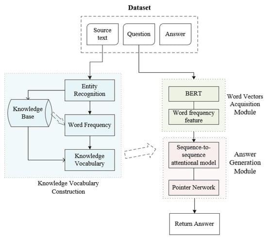 The overall implementation process of this paper is shown in Figure 1, which consists of three parts, namely the knowledge vocabulary construction module, the word vectors acquisition module, and the generative model building module. Here, vocabulary of knowledge is used in the generative model, so as to select entities with high probability in the vocabulary as the next word to be generated. In the knowledge vocabulary construction module, named entity recognition BiLSTM-CRF [28] model is used to identify entities that appear in the source text and question sentences, finding the relationship and tail entities that the entity points to in the knowledge base, counting the entities separately, then separately counting the frequency of each part of all triples corresponding to the entity. In the word vectors acquisition module, the pre-trained language model BERT [29] is used to obtain the word vectors of the question sentence and then spliced with the word frequency semantic features of the entity in the question sentence as the input sequence. In the generative model building module, a PGN model is introduced to determine whether to generate vocabulary from the vocabulary or copy vocabulary from the question sentence and return it as an answer.