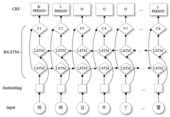 - Lample, G.; Ballesteros, M.; Subramanian, S.; Kawakami, K.; Dyer, C. Neural architectures for named entity recognition. In Proceedings of the 2016 Conference of the North American Chapter of the Association for Computational Linguistics, San Diego, CA, USA, 2–7 June 2016; pp. 260–270. [Google Scholar]