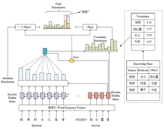 Pointer-Generator Networks [16] is a combination of the pointer network [43] and the Encoder-Decoder model based on Attention. It allows pointers to point to the generated words, and also allows the generation of words through a fixed vocabulary. In this paper, the question sentence is first passed into the BERT word frequency feature, and then entered into the Encoder-Decoder model based on Attention. The PGN calculates a generation probability for each decoder time step to determine whether to generate words from the knowledge vocabulary or copy words from the question sentence.