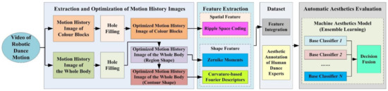 Next, based on the above three optimized MHIs, spatial feature (ripple space coding) and shape features (Zernike moments and curvature-based Fourier descriptors) are extracted, respectively, and then these features are fused together to form an integrated feature that characterizes the robotic dance motion completely. After human dance experts give their aesthetic annotations of robotic dance motions that they observed, each aesthetic annotation (label) and the corresponding integrated feature (instance) form an example of a robotic dance motion. Thus, an example dataset of robotic dance motions can be built for the following machine learning.