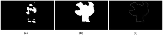 After a video of robotic dance motion (as shown in Figure 2) is acquired, it is firstly converted into two kinds of MHIs: an MHI of color blocks (as shown in Figure 3a), and an MHI of the whole body (as shown in Figure 3b). Next, the two kinds of MHIs are optimized by hole filling, and the corresponding results are generated: the optimized MHI of color blocks (as shown in Figure 4a), and the optimized MHI of the whole body (region shape) (as shown in Figure 4b). Then, by using the boundary detection algorithm [26] on the optimized MHI of the whole body (region shape), the corresponding optimized MHI of the whole body (contour shape) is generated (as shown in Figure 4c).