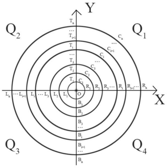 The schematic diagram of the region division in ripple space coding. The point O: the origin; Ci (i = 1, 2, …, n): the i-th concentric circle; Li (i = 1, 2, …, n): the intersection of the i-th concentric circle and the negative half axis of X; Ri (i = 1, 2, …, n): the intersection of the i-th concentric circle and the positive half axis of X; Ti (i = 1, 2, …, n): the intersection of the i-th concentric circle and the positive half axis of Y; Bi (i = 1, 2, …, n): the intersection of the i-th concentric circle and the negative half axis of Y; Qj (j = 1, 2, 3, 4): the j-th quadrant; the divided subareas: RkTkTk+1Rk+1, TkLkLk+1Tk+1, LkBkBk+1Lk+1, BkRkRk+1Bk+1, (k = 1, 2, …, n−1), OR1T1, OT1L1, OL1B1, OB1R1.