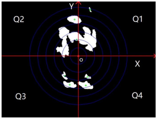 In the method of ripple space coding (RSC), a specific point in an image is firstly determined as the origin, and then several concentric circles are generated with the origin as the center. The radii of these concentric circles form an arithmetic sequence. For example, the radius (ri) of the i-th concentric circle (Ci) is i * r ( i = 1, 2, …, n), where r is a constant value of radius. Moreover, taking the origin as the intersection point, two mutually perpendicular number axes (X and Y) are generated. Thus, by intersecting these concentric circles and the two number axes, the whole image is divided into many subareas, and it is also divided into four quadrants (Q1, Q2, Q3, and Q4). Figure 5 shows a schematic diagram of the region division in this method.