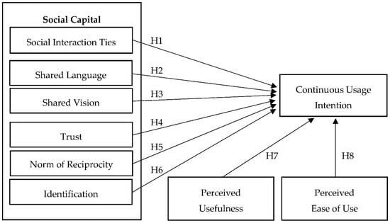 Social capital is an important driving force for the success of online brand communities [32], and it is also widely used to explain human behavior in social interaction research [33]. The structural aspect of social capital can be the relationships between individuals and groups. Online learning platforms allow users to interact with others in order to form a network of social relationships. The structural dimension of social capital is measured by social interaction ties, which is the most frequently used factor in the social capital literature [34]. Huang et al. [35] pointed out that social interaction ties are one of the factors that affect pass-along email intentions. On the other hand, the cognitive dimension of social capital is measured by perceived similarity, which is one of the important factors in social capital literature [36]. The cognitive aspect of social capital includes two concepts: shared language and shared vision. Shared language refers to that established between communities to help cooperative learning and increase communication efficiency; shared vision refers to community members having shared goals and similar values. Will these two concepts affect the continuous usage intention of online learning platforms? This is also a factor that this study was planned to explore. The relational aspect of social capital is the development of a specific relationship of trust, norm of reciprocity, and identification between network members through long-term mutual communication. Some studies on information system services also proposed that there is a relationship between trust and use intention [37,38]. Therefore, this research proposes the following hypotheses: