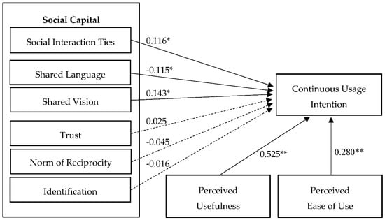 Table 7 shows that there were correlations between the dimensions. Next, we conducted further regression analysis to clarify the relationship between those dimensions. The eight dimensions of social interaction ties, shared language, shared vision, trust, norm of reciprocity, identification, perceived usefulness, and perceived ease of use were used as independent variables. The students’ continuous usage intention regarding online learning platforms was used as the dependent variable for regression analysis. The results are shown in Table 8 and Figure 2. The hypotheses are established as shown in Table 9.
