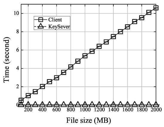 We can observe that the computation in both the data owner and the cloud server is rather small (less than ms), compared to actually re-encrypting the entire file (which is 10–200 s as estimated from Figure 4b). In addition, both are independent from the file size because only a fixed part of the entire data needs to be re-encrypted.