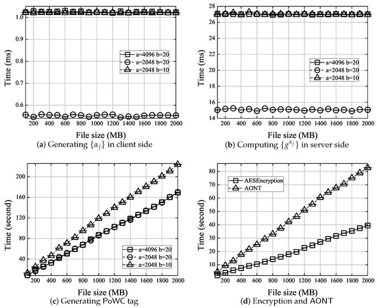In Case 1, to enable , the initial data owner needs to select a set of secret coefficients and to compute tags. Then, the data owner encrypts the file and performs on the encrypted file. From Figure 2, we can observe that: (1) The computation for generating the secret coefficients and computing is independent from the file size. In addition, this computation is mainly determined by s, which is . (2) The computation for generating tags grows linearly with the file size. Additionally, for the fixed file size, the computation for different testing cases is: . This is because, the computation for generating tags depends on the total number of symbols in a file, which . (3) The computation for AES encryption and transform is determined by the file size and approximately grow linearly with the file size.