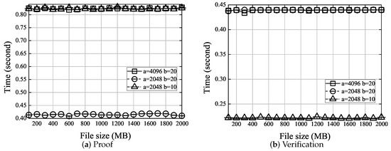 In Case 2, the prover (i.e., a potential data owner) computes the proof, and the verifier (i.e., the cloud server) verifies correctness of the proof. From Figure 3, we can observe that: (1) Both the proof generation and verification can be performed in constant time thanks to the use of spot checking (i.e., only 460 randomly picked blocks instead of the entire file are checked [34]. (2) For the fixed file size, the computation needed for different testing cases are . This is because both the proof generation and verification are mainly determined by the number of symbols in a block, i.e., s, which is .
