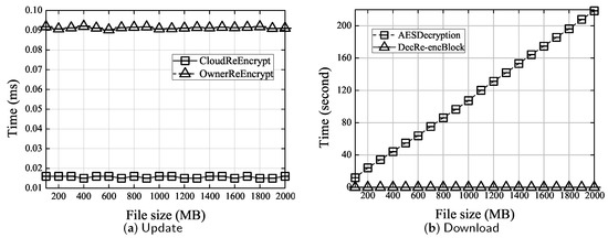 - Update. A valid data owner will cooperate with the cloud server to re-encrypt the file if the key is leaked. The results for this phase are shown in Figure 4a.