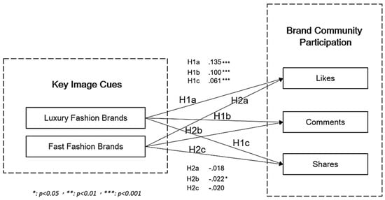 The results show that key image cues significantly influence behavioral responses. The analysis presents significant results for the impact of image cues in luxury fashion brands posts on likes. The results are β = 0.135, p < 0.000 made by users. Comments was found to have a significant impact β = 0.100, p < 0.000. Shares was found to have a significant impact β = 0.061, p < 0.000 (Table 2a). Next, the hypothesis information among fast fashion brands is supported. The behavior of users (comments) was found to have a significant impact β = –0.022, p < 0.042 made by users (Table 2b).