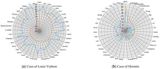 - Image cue module: The image cue module focuses on the behavioral response of comments and image cues in the content. Brand pages with significant findings include the luxury fashion brand Hermès and the fast fashion brand Nike. Image information reflects the extent to which information impacts the public [97], and information evoked in viewer memory often influences public attitudes and behaviors. Familiar information is more likely to be recalled than unfamiliar content [98]. Research on information management processing clearly demonstrates a high correlation between information familiarity and memory recall. Therefore, brand pages that continuously provide key information along with brand familiarity are more likely to evoke stronger recall [99] and more easily trigger participation in the form of comments.