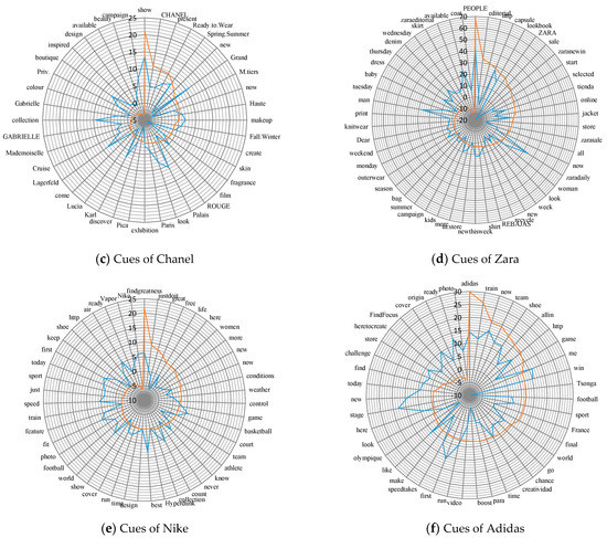 This study further integrates the recommendations and significant key image cues derived from the ensemble analysis (Figure 3a–f). This study uses three integrated analyses to compare the posts with more interactions than the average of each brand on positive cues (orange) and negative cues (blue). It was found that there are some similarities and differences in the operation of key cues of each brand. The main characteristics of the cues after comparison are as follows: