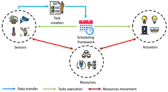 For example, let us consider a smart office system where the resource constraints are the electricity and the data bandwidth between the internal and external servers shown in Figure 1. Based on the sensors’ reading, the task creation dictates the active devices and creates the tasks based on the predefined rule. Then, the scheduling framework creates a scheduler that dictates the time for the sensors and actuators to execute the tasks while ensuring the total resources taken do not exceed the resource constraints. The scheduling framework stores the value of the resources available to keep track of the remaining resources taken by the tasks. The number of active devices and the scheduler’s computation deadline changes according to the number of people inside the building.