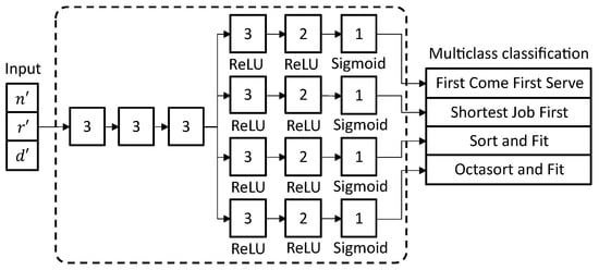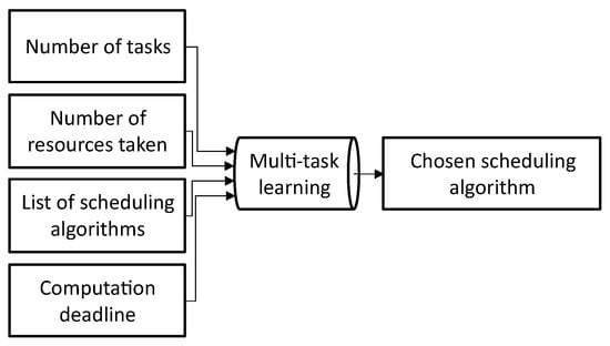 The reason why multiple scheduling algorithms are needed is because each has its trade-off in scheduler optimization and computation time. Inability to meet the requirement will lower down the user satisfaction []. This journal proposes a method of Task Scheduling Switcher (TSS)-based multi-task learning (MTL) that is shown in Figure 2 to pick the scheduling algorithm on the fly for the scheduling framework to create a scheduler with the best task execution sequence optimization under the computation deadline.