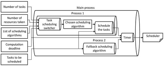 In the Main process, the Timer chooses the scheduler either from Process 1 or Process 2 based on the remaining time before the computation deadline. If Process 1 manages to compute the scheduler before the deadline, the Timer chooses the scheduler from Process 1. Otherwise, if Process 1 cannot complete the computation before the computation deadline, the scheduler from Process 2 is used. Otherwise, if both processes could not compute the scheduler under the computation deadline, the first process that completed the scheduler computation is used instead.