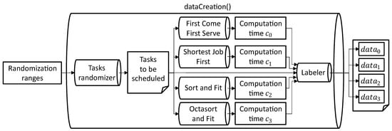 Algorithm 1 shows the pseudocode to create the dataset with 100,000 of equally labeled data. The represents the random seed value to get a replicable result, and the seed() is the function to initialize the pseudorandom number generator. Meanwhile, represents the randomization ranges for the number of tasks, resources to be taken, and the amount taken. After initializing the value of and the empty list of to store the dataset, the program will call the dataCreation() function for 25,000 times where each time the dataCreation() was called, it will create four labeled data to be saved temporarily in the before being saved in . The reasoning for four labeled data is due to each of the data corresponding to the scheduling algorithm used in this journal.