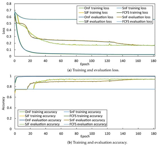 The figures that recorded the post-training log of the MTL model represent the learning curves of the exponential fall and rise to limit for Figure 7a,b. From there, we know the MTL model effortlessly retains the necessary information to classify the scheduling algorithm during the initial epochs before the rate falls into a constant. In other words, the MTL model requires shorter epoch numbers to have high accuracy in classifying the correct scheduling algorithm. Based on the shape of the learning curves and how the training and evaluation lines overlap each other for loss and accuracy, the MTL model does not suffer from the overfitting problem [].