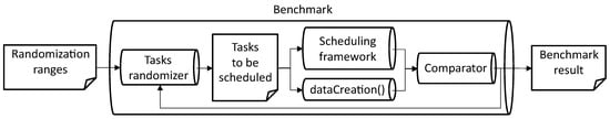 To evaluate our implementation of the scheduling framework, we create a benchmarking program to perform a stress test shown in Figure 9. Firstly, the benchmarking program creates a new set of tasks to be scheduled and process it with scheduling framework and dataCreation() in sequence. Then, the Comparator judges the accuracy of scheduling framework in meeting the computation deadline and the optimization percentage and compare it with the labeled data. This process repeats for 2500 times.
