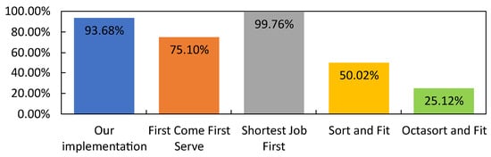 Figure 11 shows that our implementation has an average accuracy in meeting the computation deadline of . The only scheduling algorithm with the highest average accuracy in meeting the computation deadline is SJF, followed by our implementation, FCFS, SnF, and OnF. Although the result shows that SJF is better than our implementation in meeting the computation deadline, Figure 12 shows that SJF has the worst average optimization with FCFS as a base reference. Meanwhile, our implementation has an average of of optimization. Our results show that our implementation has good accuracy in meeting the computation deadline and scheduler optimization compared to the scheduling framework that only uses a single scheduling algorithm.