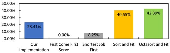 Table 1 shows the performance of the four algorithms, i.e., First Come First Serve, Shortest Job First, Sort and Fit and Octasort and Fit observed from our experiment. For example, SJF has fast computation time with low optimization, OnF has slow computation time with high optimization, SnF [] has a good balance in computation and optimization. In this journal, the scheduling algorithms applied in the experiment are non-preemptive versions.