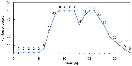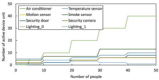 We simulated a smart office building system to schedule the IoT device units shown in Table 6, where a different number of units are installed and the number of resources consumed. The resources that act as a bottleneck in this system are the electricity and connectivity bandwidth for the local area network (LAN) and the wide area networks (WAN). For this simulation, the electricity constraint is 5000 W, the LAN constraint is 50 MB/s, and the WAN constraint is 100 MB/s. We configured the resource constraints large enough where only a small degree of optimization is plausible to make it hard to optimize the scheduler without choosing the correct scheduling algorithm. Based on the hourly number of people shown in Figure 13, the number of active device unit changes according to the activation rule shown in Figure 14.