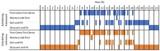 Figure 15 shows the comparison between the TSS-based scheduling framework with the correct scheduling algorithm switching called scheduling reference. To simplify the Gantt chart representation, we sampled the hourly result of the scheduling algorithms switching to five times from the original 1000 simulation data in one hour. As we can see, TSS leans toward the OnF scheduling algorithm with a low number of people, while TSS leans toward the FCFS with a high number of people. In other words, as the number of people inside the building increases, the scheduling algorithm chosen by the TSS changes from the longest computation time to the shortest computation time.