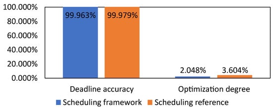 Figure 16 shows the average deadline accuracy and optimization degree calculated from 24,000 scheduler data. With the help of fallback scheduling algorithm implementation in the scheduling framework, it guaranteed almost of computation deadline accuracy. Furthermore, with resource constraints on the electricity and bandwidths not being small enough, the optimization degree on scheduling reference and scheduling framework is low, matching our configuration.