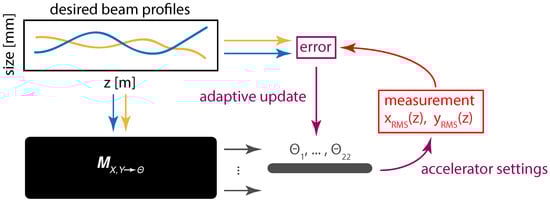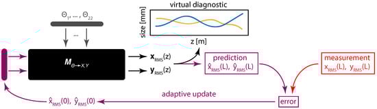 where represents an adaptive model-ML hybrid data-based learned representation of the observable O, where a trained surrogate model such as a convolutional neural network initially predicts the observable , with the prediction then refined by an online model. The adaptive ML model receives time-varying parameter estimates and an estimate of the beam’s phase space from a second model which is adaptively tuned based on the error quantifying the match between its prediction and the detected value of a rich non-invasively measured beam characteristic such as the beam’s energy spread spectrum. The parameter estimates, , ML weights , and initial beam distribution are all adaptively tuned utilizing a model-independent adaptive feedback control method.