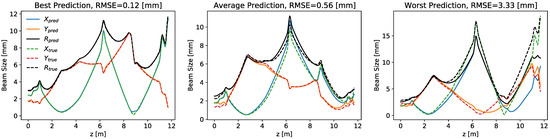 Comparison of the best (left), average (midddle) and worst (right) NN predictions for beam envelopes.