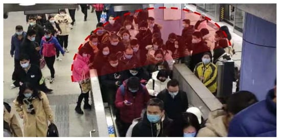 With the rapid development of urban public transport, due to the advantages of large capacity, convenience and efficiency, and green environmental protection, subway undertakes the most public transportation pedestrian flow [1]. The highest average daily pedestrian volume has been more than 13 million in Beijing subway in 2019, meaning the “massive pedestrian flow” has become the “new normalcy” in Beijing subway. Under the “massive pedestrian flow”, pedestrians keep gathering at the bottleneck in the transit hub. When the pedestrian flow far exceeds the capacity of the bottleneck, pedestrian arching will occur at the bottleneck [2], as shown in Figure 1. At this time, the force between pedestrians in the arch is transmitted to each other, and the huge pressure is concentrated at the bottleneck entrance, which is not conducive to the passage of pedestrians. The safety hazard exists, and a stampede accident may occur in serious cases. Therefore, it is necessary to study the inherent law of pedestrian arching. Accurately grasp pedestrian behavior characteristic of arching and study the evolution of the pedestrian arching, is a pressing issue to pedestrian management and subway facility design.