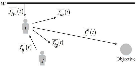 Helbing and Molnar [18] firstly constructed the basic social force model of pedestrian movement under the normal state. The core idea of social force model is that the pedestrians’ movement is influenced by purpose, interaction between pedestrians and influence from surrounding obstacles, as shown in Figure 2. Moreover, these influences are expressed by equation, which is similar to mechanics. Pedestrian movement process can be described by the following partial differential equation.