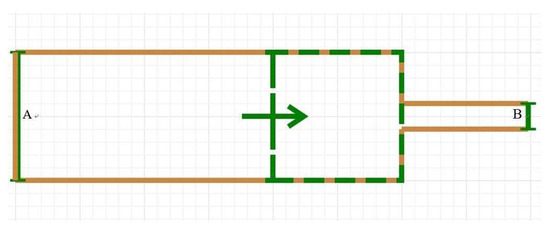 Refer to typical transit hub bottleneck (changes in width), experiment scenario was set, as shown in Figure 3. The corridor length is 10 m, which is fixed. Besides, the corridor width is 5 m, 4 m and 3 m, which is variable. The bottleneck corridor length is 10 m, 5 m and 1 m, which is variable. Moreover, the bottleneck corridor width is 2 m, 1.5 m and 1 m, which is variable too. In total, 27 scenarios are set up for analysis. Pedestrian enters in experiment scenario at the entrance A, and leave at the exit B. The walking direction is indicated by the green arrow.