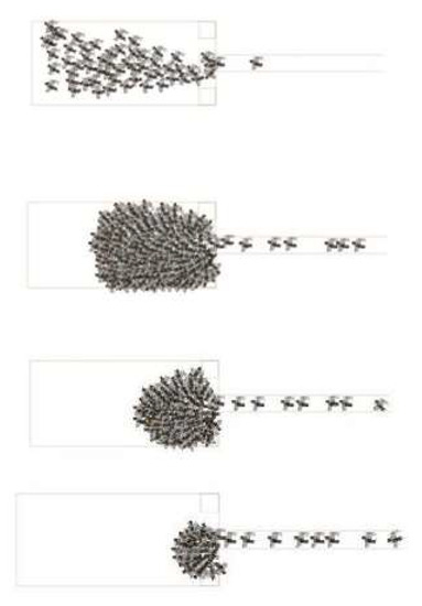 According to the simulation results, pedestrian arching presents a common regularity, as shown in Figure 4. When pedestrian density is low, pedestrians walk straight to the bottleneck entrance. As the number of pedestrians gradually increased, the density of the pedestrian increased too. Then pedestrians start queuing in line, appearing an arching phenomenon at the bottleneck entrance. Due to the periodicity of the pedestrian flow in subway transit hub, when pedestrian arching reaches a certain length, the dissipation is beginning.