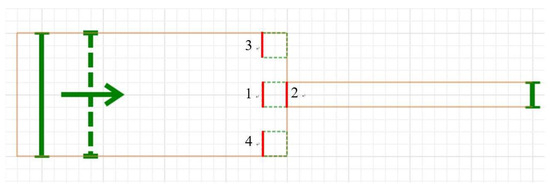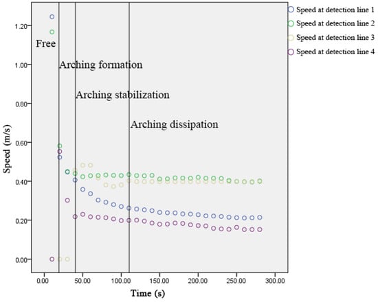 In order to analyze the evolution of the pedestrian arching further, speed detection lines were set at the position of 1, 2, 3 and 4 in the simulation scenario, as shown in Figure 5. Each detection line is 1 m wide.