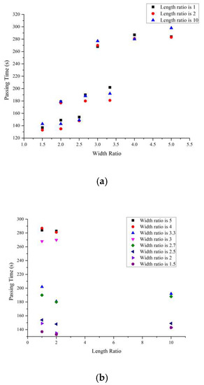 Relations between bottleneck scenario and passing time. (a) scatter diagram of width ratio and passing time and (b) scatter diagram of length ratio and passing time.