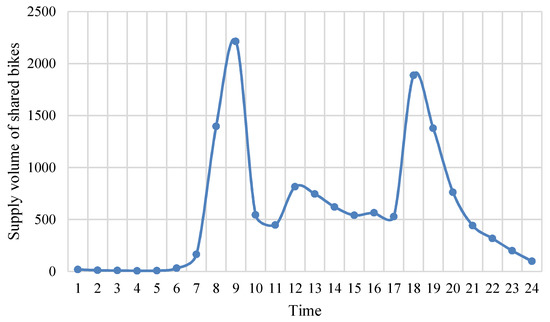The initial quantity of shared bikes must meet the demand in each TAZ, and the initial repositioning quantity of shared bikes was set to 0. Using the output results for and in the model, the supply volume of shared bikes in each period and TAZ could be obtained. The calculation formula for the supply volume in each period is as follow: