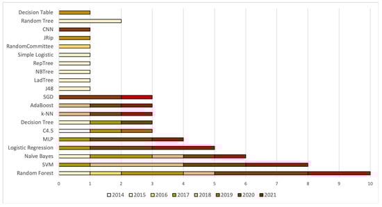 As shown in Table 4, when focusing on the datasets employed, it is deduced that numerous works rely on outdated (and no more updated) datasets. Specifically, Drebin, dated back to 2012, is the most used dataset, utilized in almost half of the surveyed works. On the other hand, Contagio Mobile and MalGenome are used in 4 and 2 works, respectively. However, the former is dated back to 2010, while the latter to 2012. Recall that previous work has shown that feature importance changes across datasets of different age [,].