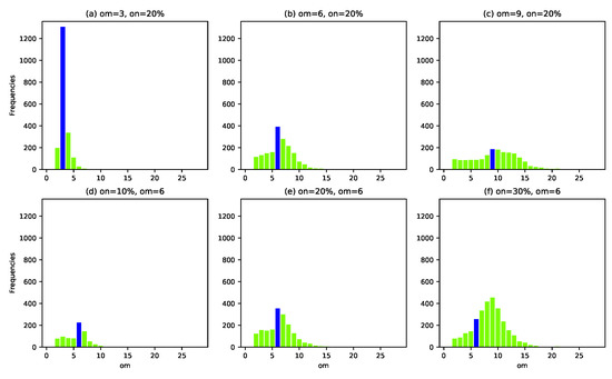 Both the leaving and joining actions are executed repeatedly until no node changes its community enrollments, or up to a designated number of times. Leaving actions should be carried out first. These rectifications may change the overlapping memberships of some nodes. The distributions of amended community memberships (except one) of generated networks are shown in Figure 2. As can be seen, overlapping memberships spread in a wider range, compared with the original same one designated by for all overlapping nodes. The blue bar stands for the specified . Moreover, there are some nodes of which their communities become singleton, namely with just itself as member. All in all, the community structures of these networks become more complicated and are more likely as what should be in real networks.