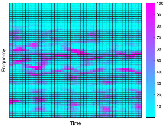 In our experiments, the recording has a duration of 10 s and a frequency range from 0 to 64 Hz. By using the time-to-frequency transformation module in the accompanying software, the collected EEG data contains energy values with a time resolution of 0.125 s and a frequency resolution of 0.25 Hz. Therefore, the obtained data in one recording can also be plotted as a spectrogram. Figure 2 shows the spectrogram of a portion of a recording from a subject in the relaxation state. In the figure, the grid on the bottom left corner has a frequency band from 4 Hz to 4.25 Hz at time 5 to 5.125 s. Its energy value is between 0 and 20 (based on the color bar). It is observed that most time-frequency grids have very small energy values, with only a few grids with large values. Actually, the energy values of this recording have a maximum of 367, a minimum of 0, a mean of 5.01, and a standard deviation of 13.56.