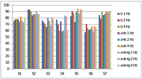 The results for experiment two are given in Table 4. The experimental results show some degree of consistency with our previous experiment, such as , 1 Hz has lower accuracy. However, in contrast to our previous experiment, the results here show that wider bandwidth (BW = 4 Hz) yields higher average accuracy than narrower ones. Furthermore, note that the average accuracy is higher than previous one. As to the BPNN classifier, the average accuracy is still lower than that of SVM, but the difference is much smaller, only about 2 to 3%.