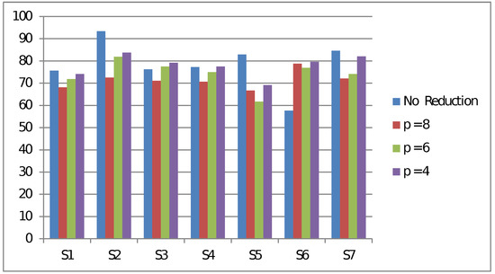 The experimental results are given in Figure 5. The results show that some subjects have lower accuracy after FA reduction, whereas some have higher accuracy, especially subject 6. Note that in the p = 8 case, one second of EEG signal produces 8 values after FA reduction, so a feature has a dimension of . The same feature dimension is obtained in the case of only with BW = 2 Hz. Similarly, p = 4 has the same feature dimension as the only, BW = 4 Hz case. When comparing FA with and only with BW = 4 Hz cases, we find that the average accuracy of the FA approach is slightly higher (77.9% vs. 77.0%). However, the performance difference is not sufficiently large to claim that FA is a better method. Nevertheless, we find that the standard deviation of the FA approach is much lower (4.9% vs. 12.9%). So, the accuracy variation among subjects is reduced. To this end, it may be worth conducting further research to see if any particular dimensionality reduction technique works better for the EEG signal in terms of minimizing the standard deviation.