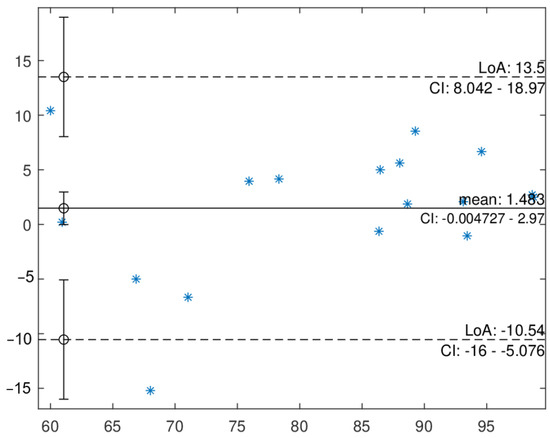 The Bland–Altman plot for + + , 4 Hz case. The LOA means limits of agreement and CI is the confidence interval.